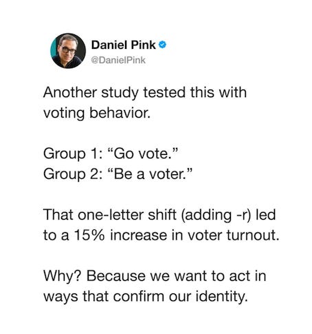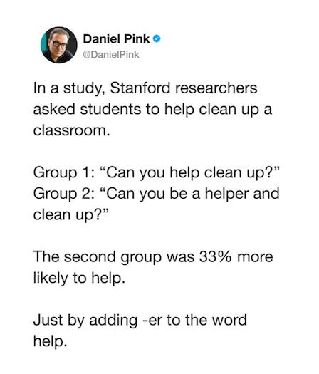 Pink concludes that using nouns instead of verbs as part of a request is motivating in that it allows the listener to see themselves as the actor in the situation, with a particular identity. Seeing themselves as the noun, the listener has ownership of the action, what would otherwise be the non-personalized verb.